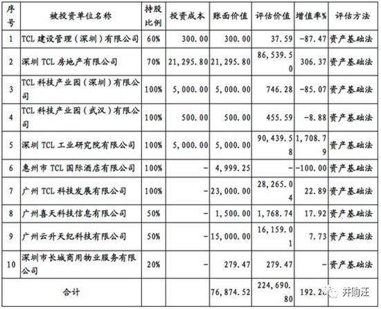 可以看到,有两项资产的估值是负的,TCL实业100%股权评估值为-7.98亿,格创东智100%股评估值为-2.18万。估值最高的两家公司分别为TCL产业园100%股权的32.94亿和惠州家电100%股权的10.43亿。