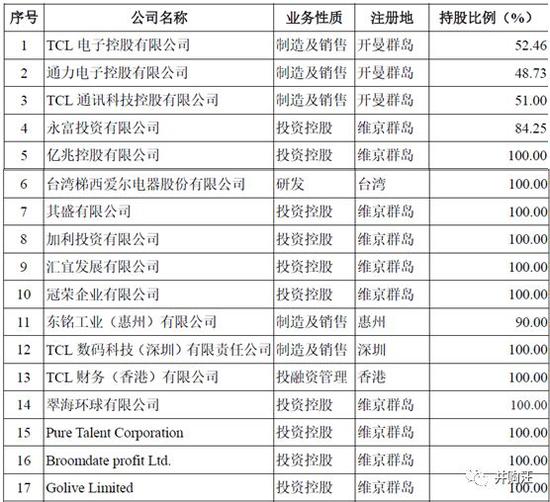 此次剥离的资产中,最核心的就是TCL实业,TCL实业为持股平台,共有272家子公司,其中一级子公司有如下17家: