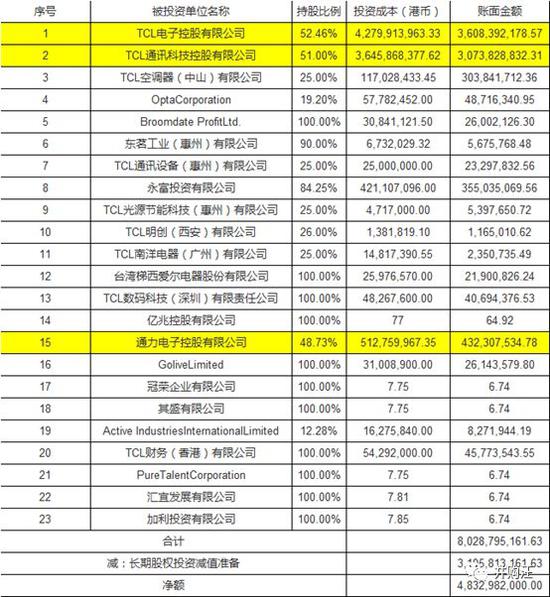这23项长期股权投资中,最重要的也是估值最高的有三家子公司:TCL电子、TCL通讯科技、通力电子。