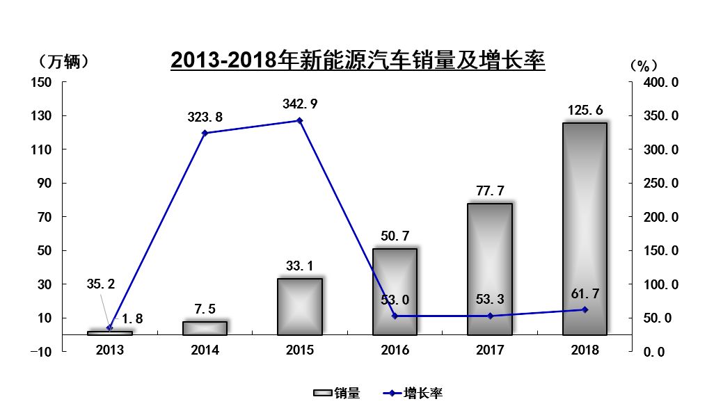 中汽协数据显示,2018年,中国新能源汽车产销分别完成127万辆和125.6万辆,比上年同期分别增长59.9%和61.7%。保有量方面,公安部最新数据显示,2018年中国新能源汽车保有量为261万辆,占汽车总量的1.09%。