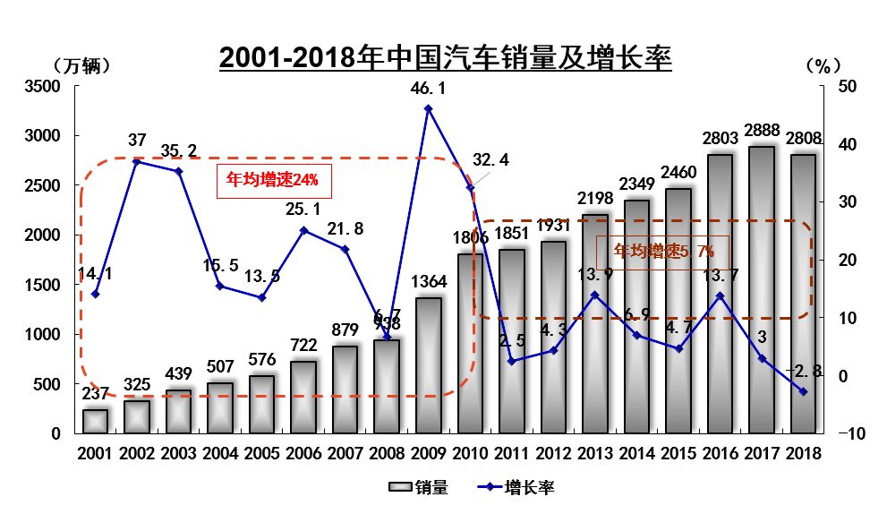 2018年下半年以来,中国汽车市场销量连连“踩刹车”,累计增长率持续下降。
