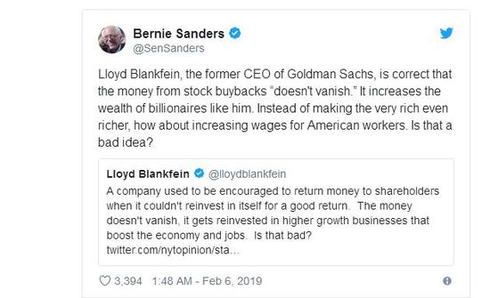 对此桑德斯迅速予以反击,他转发布兰克费恩的推特并回应称:“高盛前CEO劳埃德-布兰克费恩说,回购股票的资金‘不会消失’,这是正确的。它增加了像他这样的亿万富翁的财富。与其让非常富有的人变得更富有,不如增加美国工人的工资。这是个坏主意吗?”
